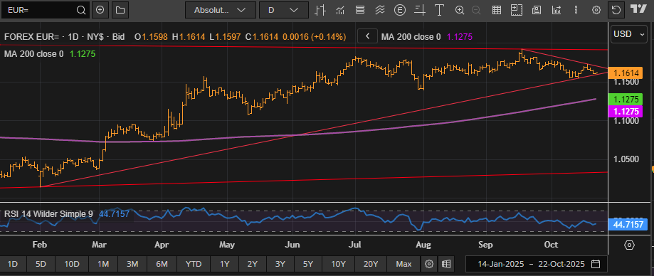 The euro faces a challenging environment characterized by gradual monetary policy easing with limited credit transmission, persistent political instability in France, modest economic growth prospects in Germany, and ongoing trade policy uncertainty. EUR/USD trades near 1.16, under short-term bearish pressure despite maintaining a longer-term uptrend. Market participants await ECB President Lagarde’s speech today for further policy guidance before the central bank enters its blackout period ahead of next week’s meeting. The eurozone economy shows tentative growth momentum, particularly in services, but manufacturing remains weak and faces headwinds from trade tensions and subdued external demand.