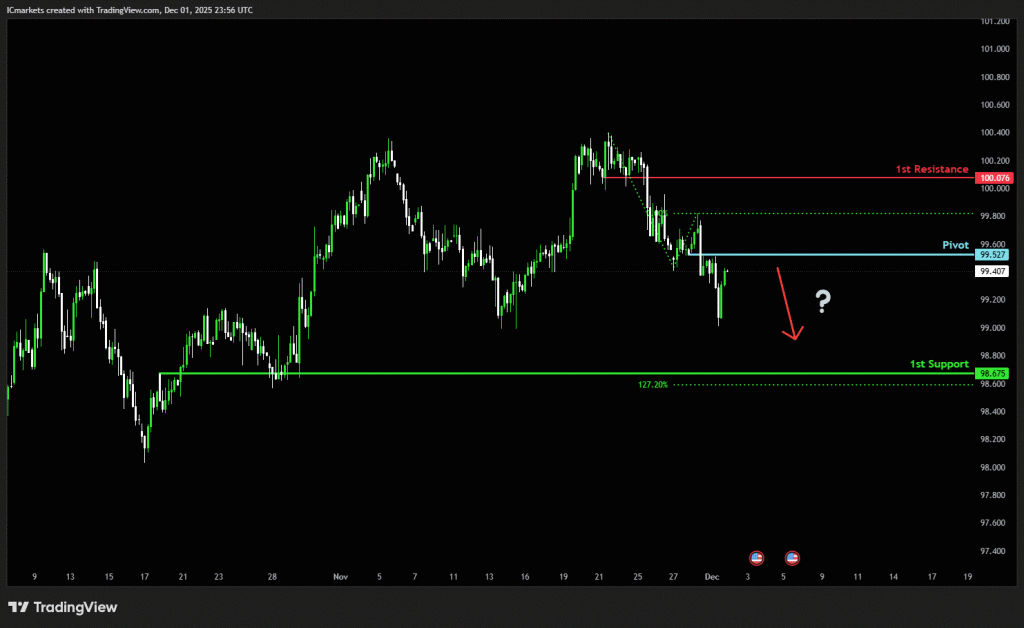 The U.S. Dollar Index (DXY) is trading soft around 99.40–99.50, hovering near a 2-week low. Weak economic data has cemented expectations for a rate cut. Markets are now pricing in an 87% chance that the Federal Reserve will cut rates by 25 basis points at its December 10 meeting. Investors are awaiting JOLTS Job Openings data and comments from Fed Chair Jerome Powell (scheduled for later today), which could further confirm the dovish outlook.