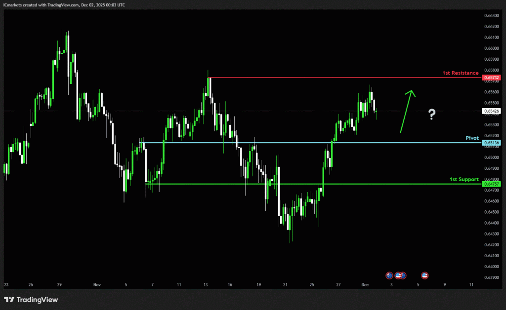 The NZD is in a consolidation phase after a central‑bank‑driven rebound, supported by a “near‑end” to RBNZ easing and slightly better local data but capped by a still‑weak domestic economy and dependence on global risk appetite. For intraday trading on 2 December 2025, watch GDT headlines, U.S. data, and Fed‑related commentary, and broader risk sentiment rather than any major scheduled New Zealand releases.