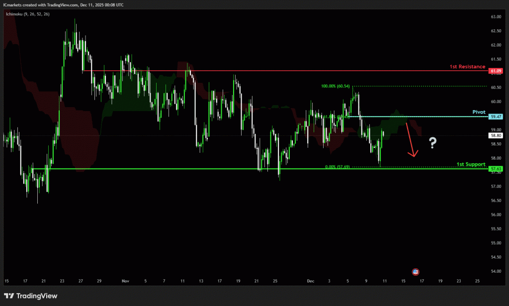 Oil is trading slightly lower to steady around the high‑50s to low‑60s per barrel region on Wednesday, 10 December 2025, with markets focused on a mix of soft demand expectations, recovering supply, and major central‑bank decisions that could affect future energy consumption. Geopolitical risk from the Ukraine conflict and tensions involving Russia and Venezuela is providing a floor under prices, as traders weigh the chance of further disruptions to Russian exports or sanctions changes.