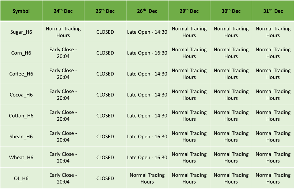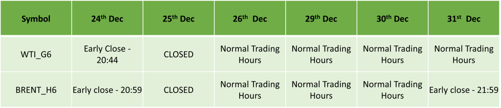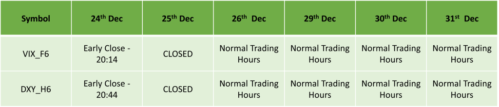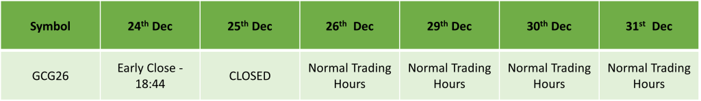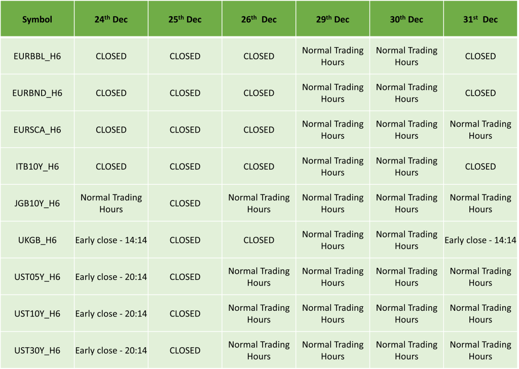 Liquidity over the holidays is expected to be particularly thin so please take the necessary precautions to ensure you are not affected by increased volatility, spreads and intermittent pricing.