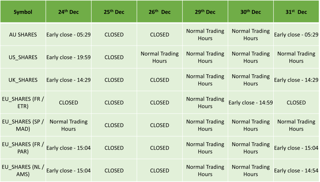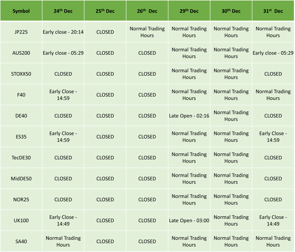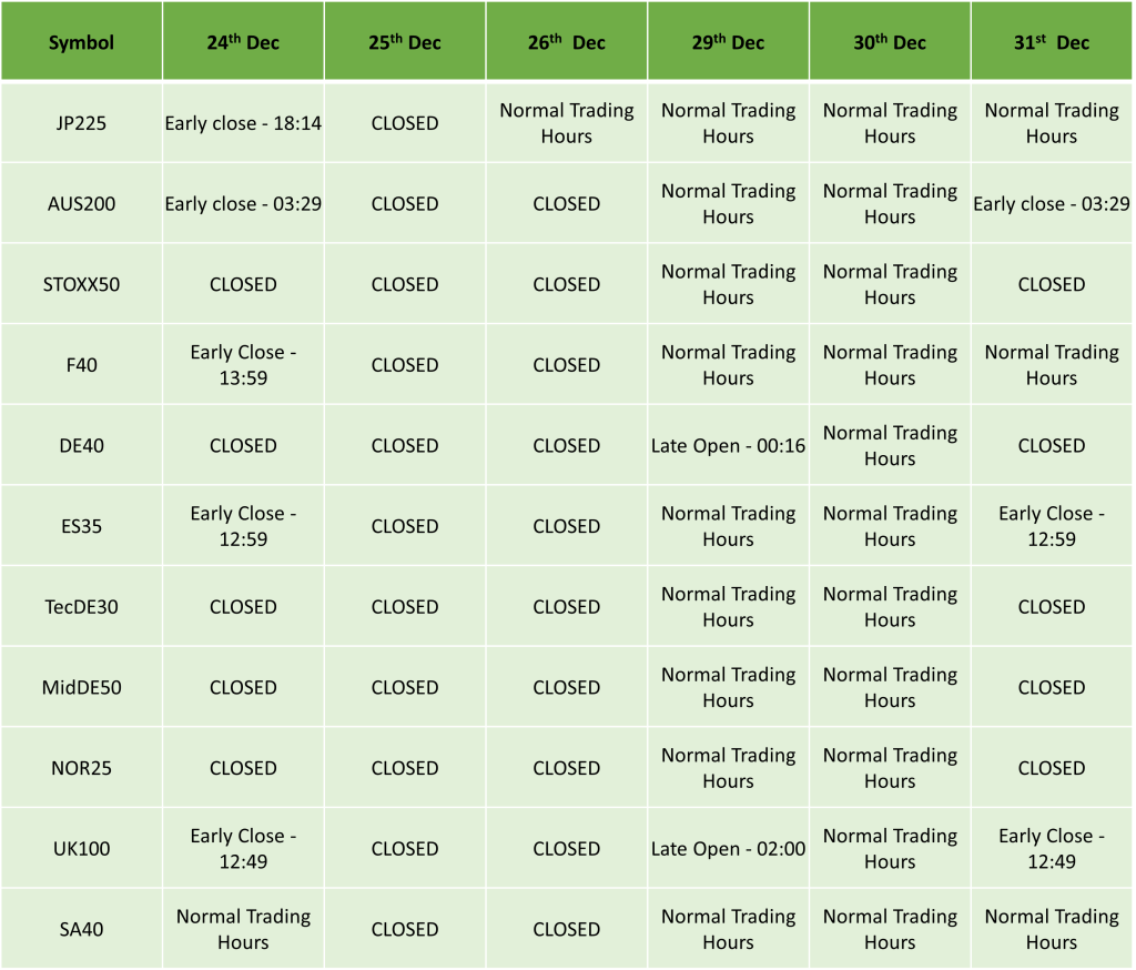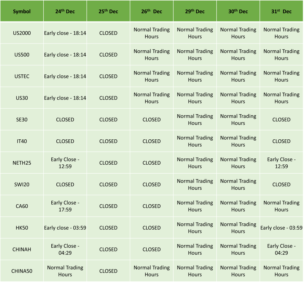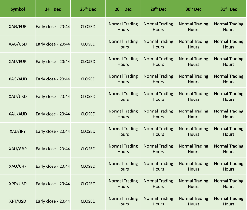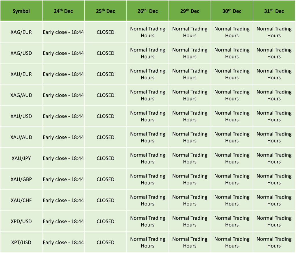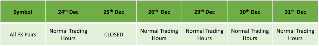 Please find our updated trading schedule for the Christmas, Boxing Day and New Year’s Day holidays below.