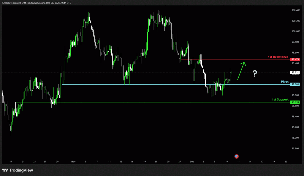 The US Dollar Index (DXY) stands near 99, following a rise to 99.23 on December 9 amid market anticipation for the Federal Reserve’s interest rate decision expected today, potentially including a 0.25% cut as the third of 2025. Markets remain focused on the Fed’s final meeting of the year, with growing divisions among officials and recent economic data like PCE inflation shaping expectations for policy easing, which has contributed to the dollar’s recent weakness, down 0.36% over the past month and 6.74% yearly.