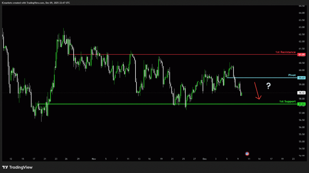 Oil is trading slightly lower to steady around the high‑50s to low‑60s per barrel region on Wednesday, 10 December 2025, with markets focused on a mix of soft demand expectations, recovering supply, and major central‑bank decisions that could affect future energy consumption. Geopolitical risk from the Ukraine conflict and tensions involving Russia and Venezuela is providing a floor under prices, as traders weigh the chance of further disruptions to Russian exports or sanctions changes.