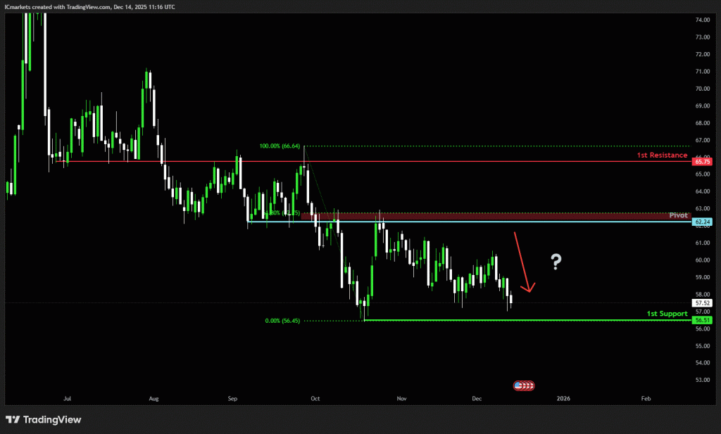 On Monday, 15 December 2025, oil staged only a mild bounce, with Brent around the low 60s and WTI in the high 50s, after both benchmarks slid more than 4% last week and now trade near two‑month lows. The key narrative is that expectations of a sizable global surplus and high inventories outweigh fresh geopolitical worries, including U.S.–Venezuela tensions, so rallies are being sold and sentiment remains broadly bearish even as traders trim some short positions today.