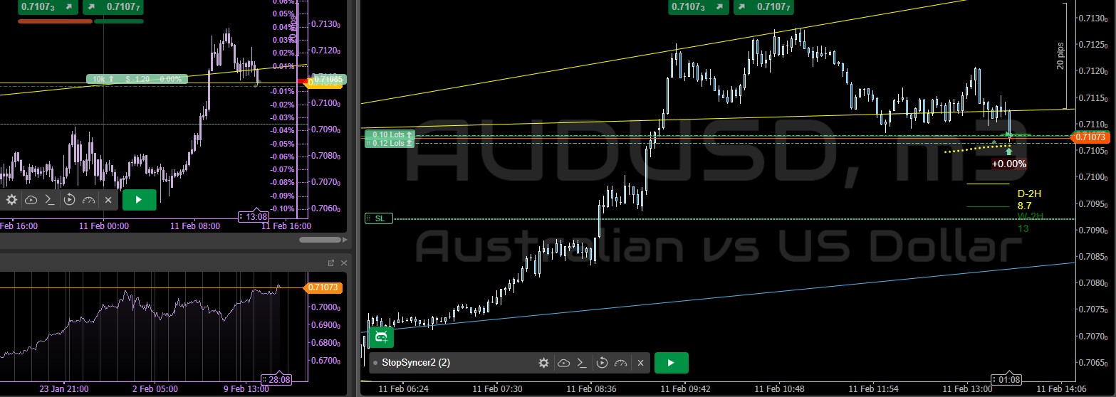 13:56 price is hugging Vwap 4 minutes before Frankfurt, this is usually a sign of something bad about to happen, especially with EUR and CAD not yet at the vwap, those assets retesting will cause a significant drop down on AUD (even if its just temporary volatility) thats why there is one more Buy Limit close to SL.